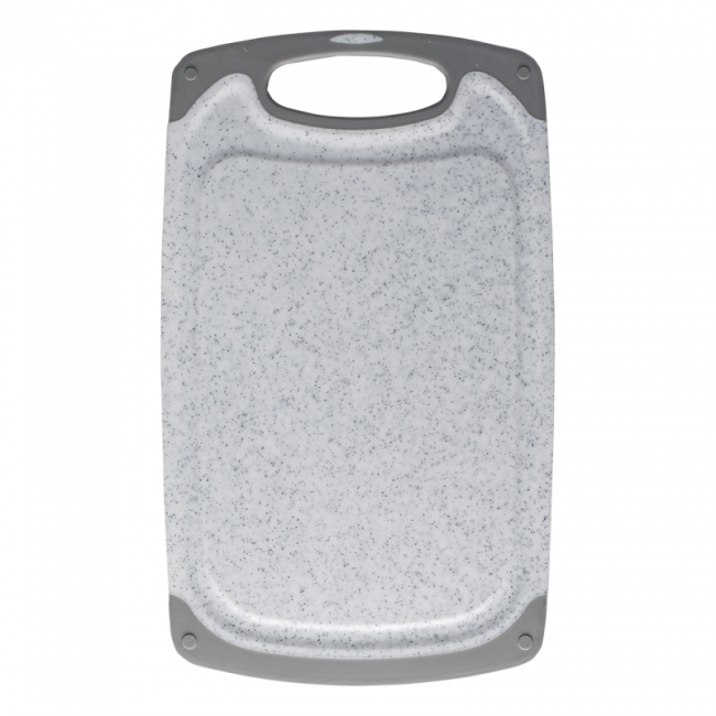 Nicht nur gutaussehend, sondern auch praktisch. Das Schneidebrett mit elegantem Granitdekor ist ein effektvoller und effektiver Helfer im Haushalt. Die Kerbe am Umfang fängt Flüssigkeiten von Lebensmitteln auf und schützt so die umgebene Kücheneinrichtung.