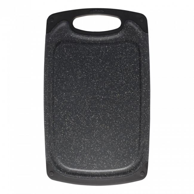 Nicht nur gutaussehend, sondern auch praktisch. Das Schneidebrett mit elegantem Granitdekor ist ein effektvoller und effektiver Helfer im Haushalt. Die Kerbe am Umfang fängt Flüssigkeiten von Lebensmitteln auf und schützt so die umgebene Kücheneinrichtung.
