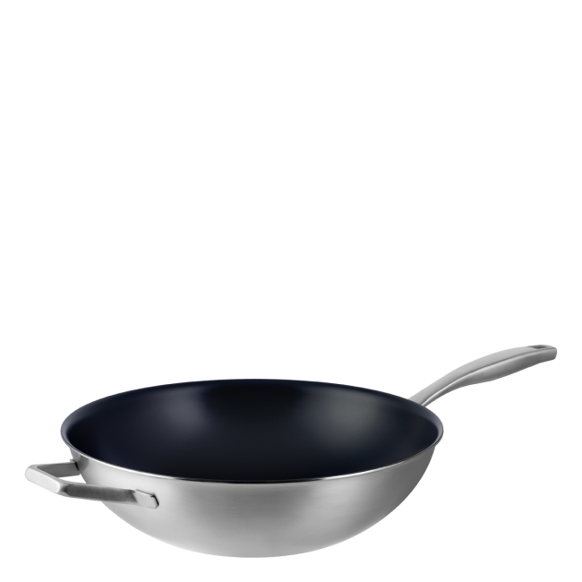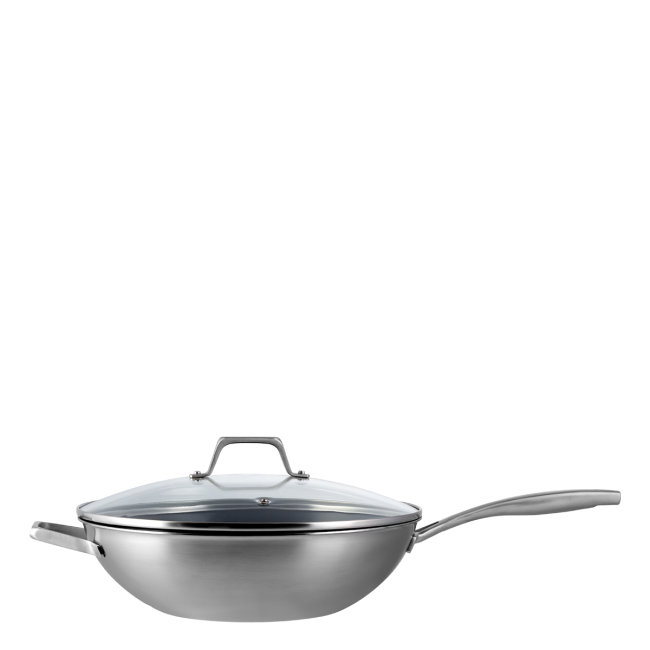 Die breiten, abgerundeten Wände sind ideal zum Mischen der Zutaten, ohne dass etwas verschüttet wird – perfekt für die Zubereitung asiatischer Gerichte, Stir-Fry oder grösserer Portionen. Der transparente Glasdeckel hält Dampf und Geschmack im Inneren, während ergonomische Griffe eine komfortable Handhabung gewährleisten.