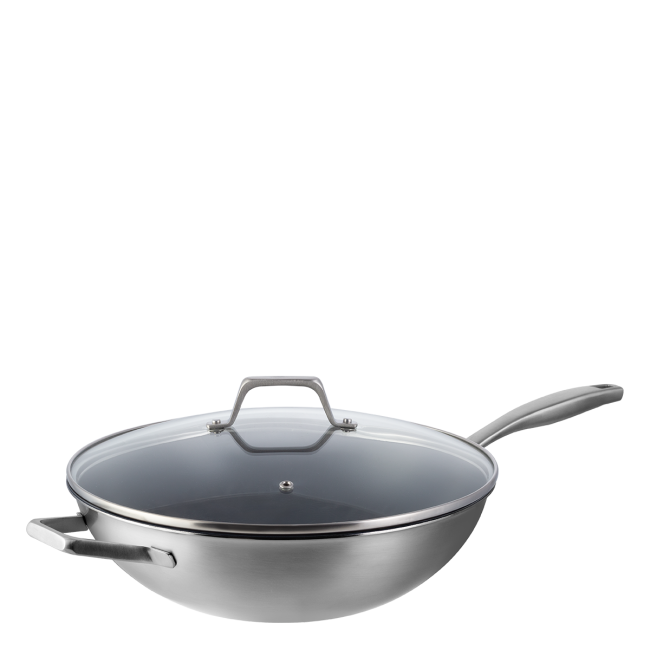 Die breiten, abgerundeten Wände sind ideal zum Mischen der Zutaten, ohne dass etwas verschüttet wird – perfekt für die Zubereitung asiatischer Gerichte, Stir-Fry oder grösserer Portionen. Der transparente Glasdeckel hält Dampf und Geschmack im Inneren, während ergonomische Griffe eine komfortable Handhabung gewährleisten.