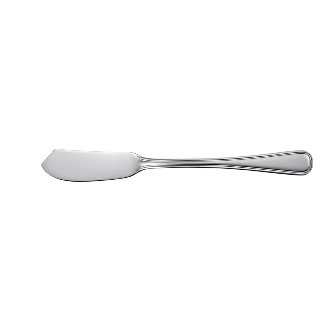 Fish knife Avalon with mirror look is made of high quality chrome steel 18/0. The round ended knife handle is decorated with a sipmle line on the round. This product is suitable for industrial dishwashers. 10 years guarantee of re-purchasing.