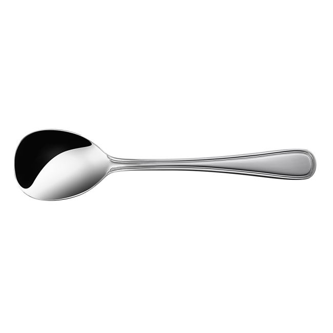 Gourmet spoon Avalon with mirror look is made of high quality chrome nickel steel 18/10 with 3 mm material thickness. The round ended spoon handle is decorated with a sipmle line on the round. This product is suitable for industrial dishwashers. 10 years guarantee of re-purchasing.