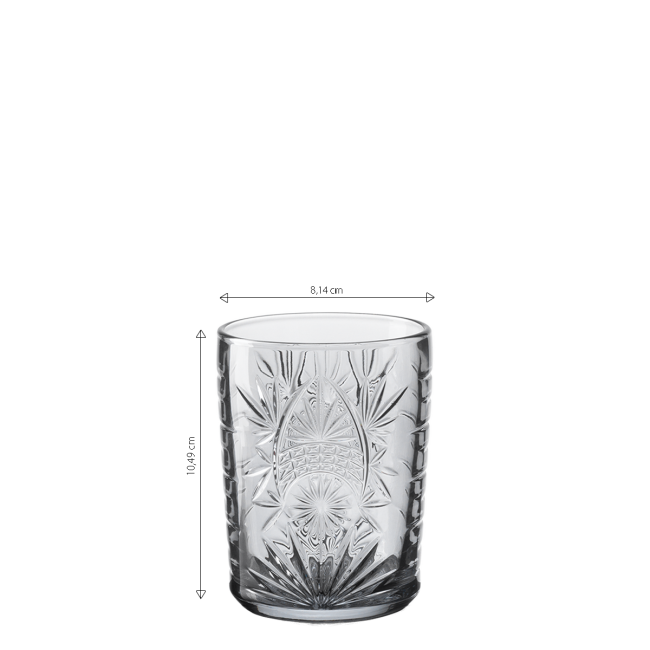 The tinted glass cup features a distinctive embossed pattern that highlights its elegant appearance. Its straight shape and solid base ensure stable and practical use in food-service environments. It is dishwasher-safe. Made of tempered glass with a reinforced upper rim for increased impact resistance.