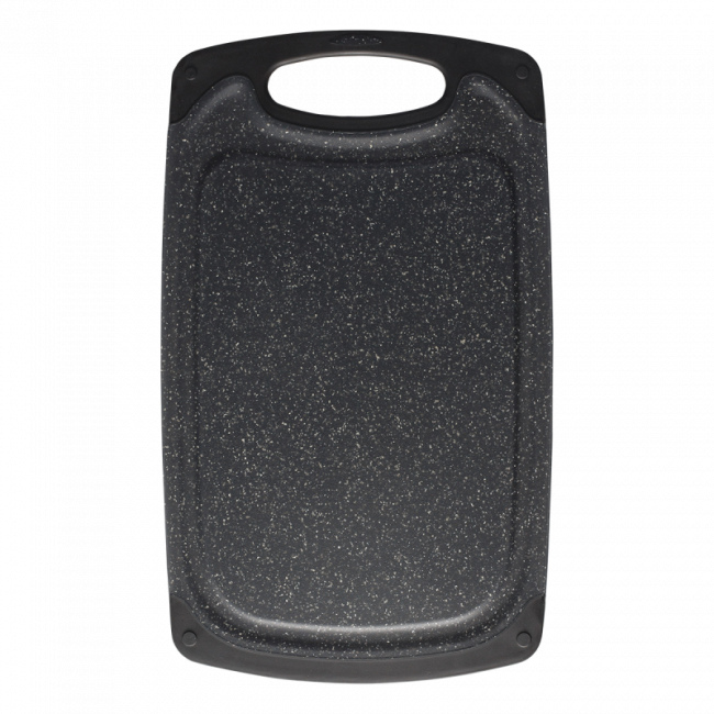 Nicht nur gutaussehend, sondern auch praktisch. Das Schneidebrett mit elegantem Granitdekor ist ein effektvoller und effektiver Helfer im Haushalt. Die Kerbe am Umfang fängt Flüssigkeiten von Lebensmitteln auf und schützt so die umgebene Kücheneinrichtung.