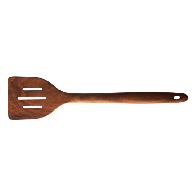 Spachtel mit Schlitz, hergestellt aus massivem Buchenholz. Dieses Material zeichnet sich durch eine hohe Widerstandsfähigkeit aus. Diese Produkte eignen sich hervorragend für Geschirr mit Antihaft-Oberfläche. Die Holzspachteln sind nicht für gewerbliche Spülmaschinen geeignet.