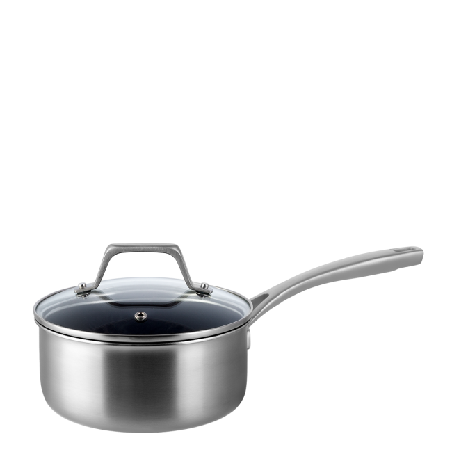 The saucepan with lid is designed for efficient and reliable cooking. The multi-layer construction combines a durable titanium surface, an aluminum core, and ferromagnetic stainless steel, ensuring even heat distribution, thermal stability, and optimal energy efficiency.