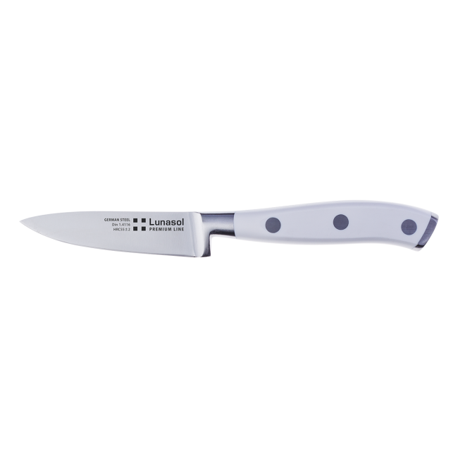 Lunasol knife is suitable for cutting bread and pastry. The premium knife has a 20 cm forged blade and a white handle. The knife has a reliable serrated blade made of German steel. The knife is suitable for industrial dishwasher.